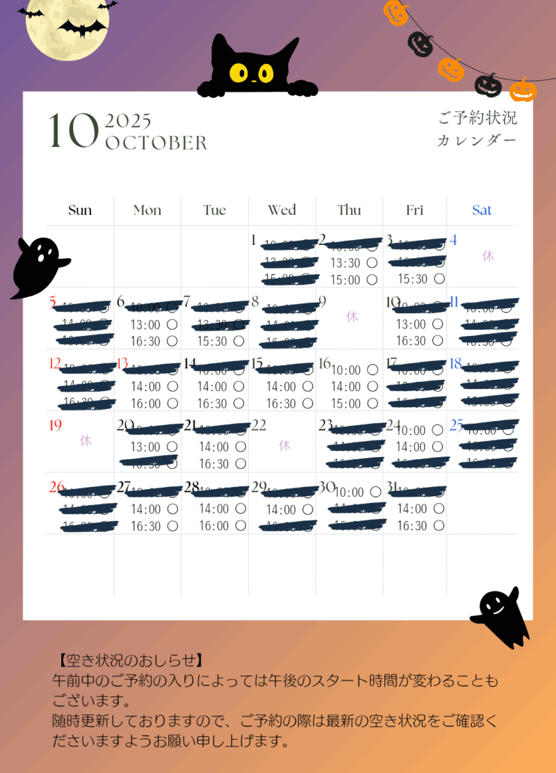 最新の空き状況は公式LINEから、「空き状況」の確認アイコンをタップして自動返信で確認することができます。ご利用ください。